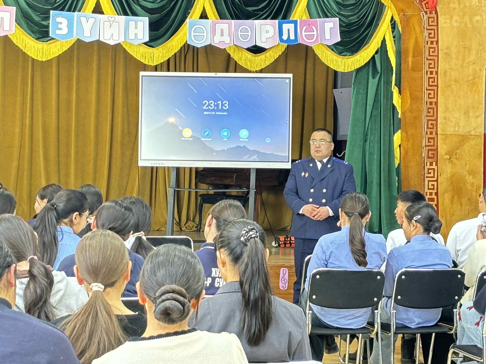 Хужирт сумын гэмт хэргээс урьдчилан сэргийлэх салбар зөвлөл, Хархорин сум дахь сум дундын прокурорын газар хамтран 2025 оны 11 дүгээр сарын 13-ны өдөр ахлах ангийн сурагчдад "Хүүхэд хохирсон, холбогдсон хэргийн судалгаа" сэдвээр, албан байгууллагуудын дарга эрхлэгч нарт "Авлига, ашиг сонирхлын зөрчлийн хор хөнөөл, урьдчилан сэргийлэх арга зам" сэдвээр, албан хаагчдад Согтуугаар үйлдэгдсэн хэрэг зөрчлийн талаар тус тус сургалт орлоо.